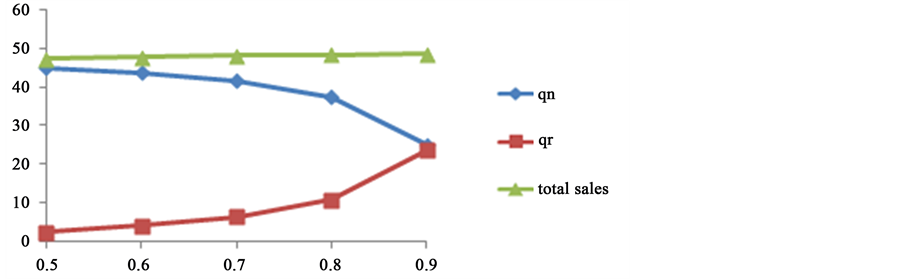This shows that as consumers get more and more recognition to the quality of the remanufactured products, and its price is lower than new product, so more and more people will choose to buy remanufactured products, which leads to reduce the purchase of new products, but on the whole, total sales still increases with the increase of consumer preference.