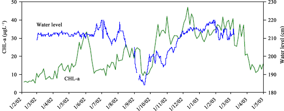 Figure 2. Pattern of variations of Lake Guiers CHLa contents and water level in the observation period February 2002-May 2003 (modified after [19] ).