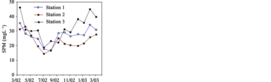 Figure 3. Pattern of variations through time of SPM concentrations in Lake Guiers for the observation period from March 2002 through March 2003. Note: SPM concentrations shows similar variation at the three stations, with values in range of 15 - 45 mg∙L−1 ([25] ).