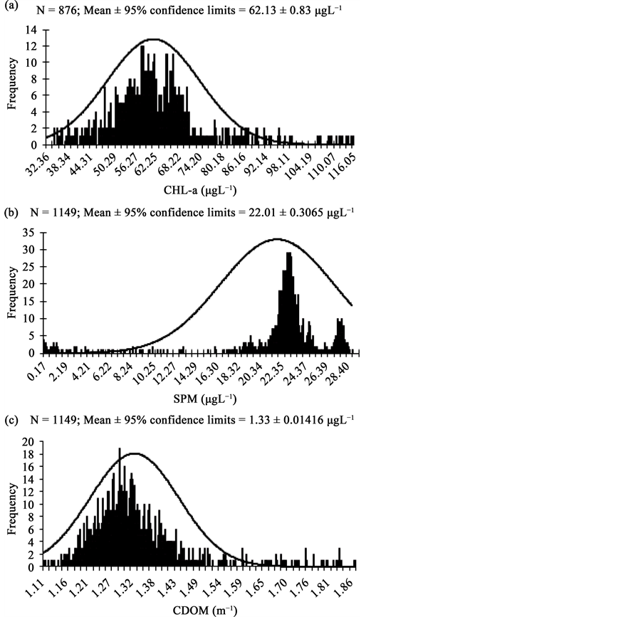 Figure 4. Frequency histograms with fitted normal distribution curve for (a) CHLa values (b) SPM values and (c) CDOM values.