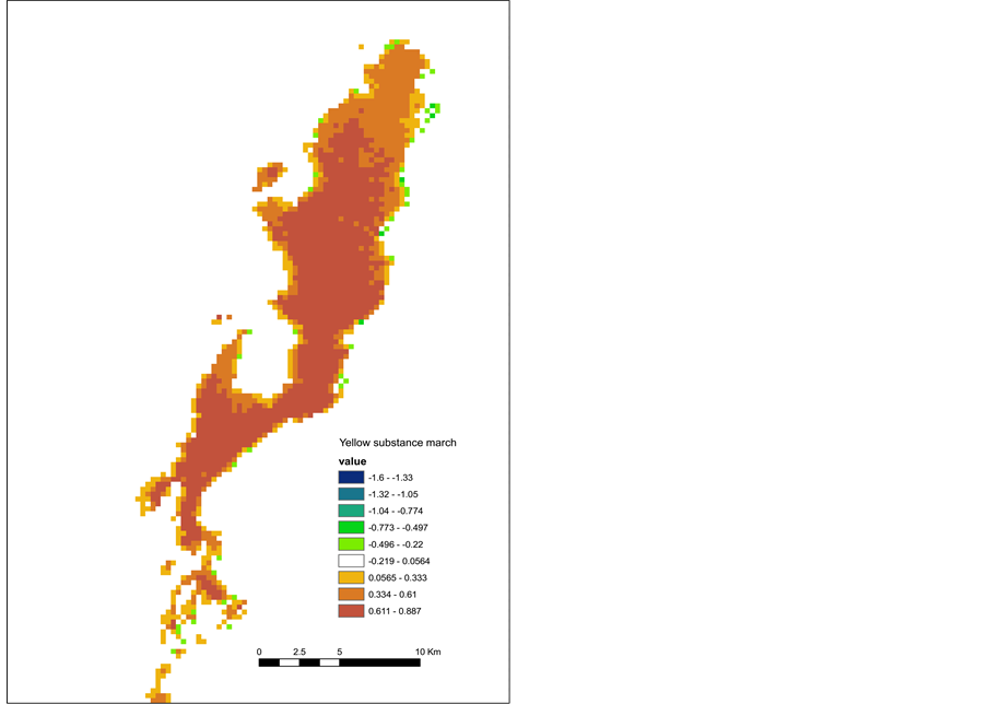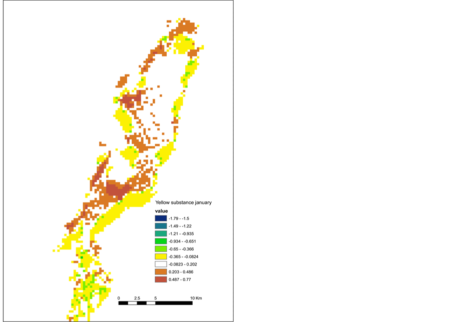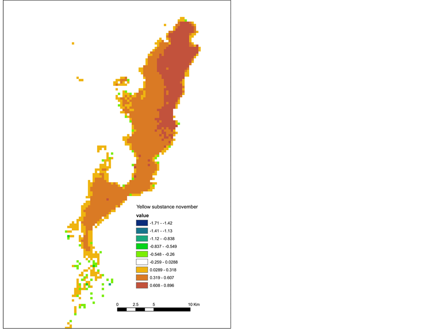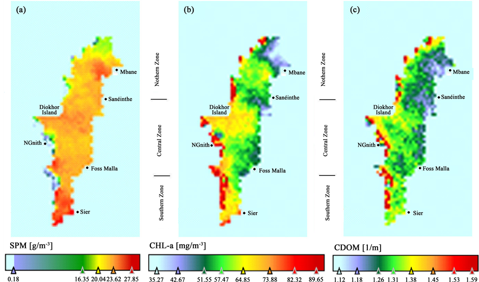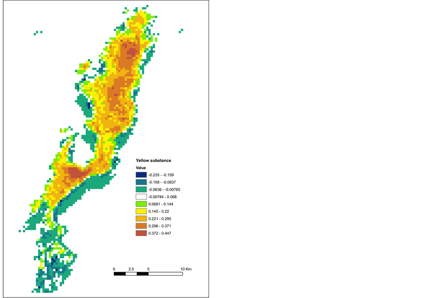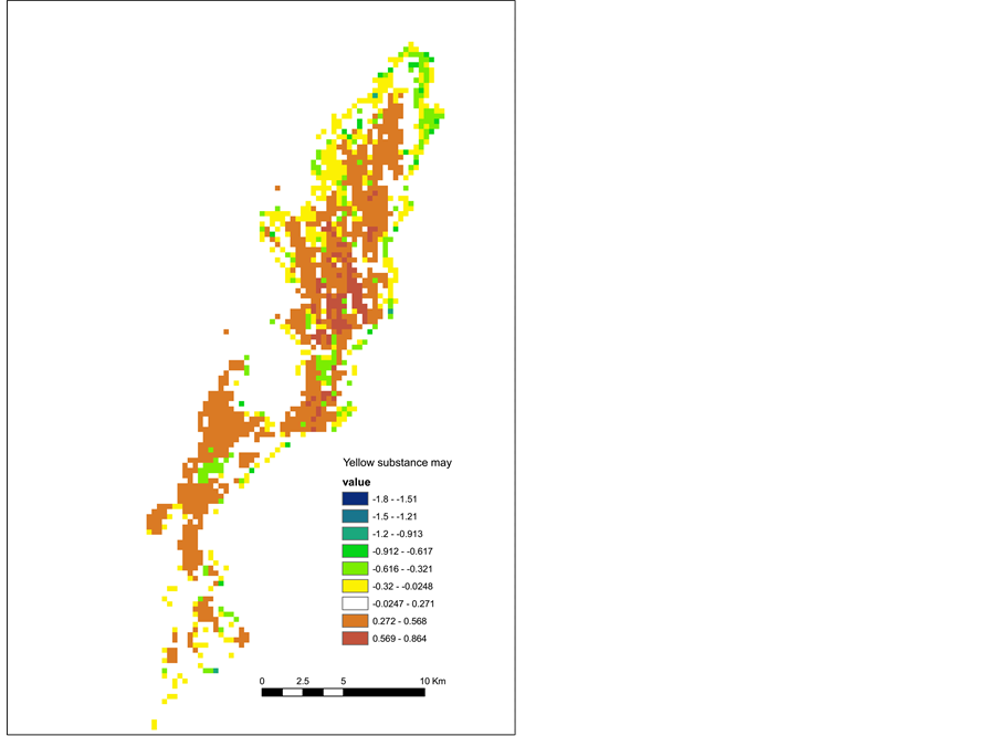 Long-range forecasting: Long-term mean-concentration values that would provide indications on the lake dynamics over time are presented in Figure 9. They range from 2.22 to 23.7 mg・L−1 for SPM, 0.134 to 29.3 μg・L−1 for CHLa and 0.081 to 0.447 m−1 for CDOM. These values are within the range of those sampled from the MERIS 1b-product level. Based on the differences in pixel color, it is possible to suggest that SPM concentrations are highest where fairly high energy conditions prevail (Figure 9(a)), viz., in the feed-water entrance of the northern zone, along the eastern near shoreline bank, and the central off-shore zone. These are places where turbidity currents and bottom currents dominate the lake hydrodynamics. In contrast, the lower SPM estimates obtained downstream, in the barrier islands protected southern inshore zone and along the western margins, are attributed to the possible influence of the vegetation. Indeed, the aquatic plants invading these shallow water environments decrease the hydrodynamic conditions, thus allowing suspended sediment to settle. These low energy environments where algal growth might be favoured, are seen (Figure 9(b) and Figure 9(c)) to exhibit the highest CHLa and CDOM values, yielding maximum pluriannual means in the ranges 23 - 29 μg・L−1 for CHLa and 0.294 - 0.447 m−1 for CDOM. The correlation between these two parameters is reflected in the similarity of their geographical distribution pattern as shown in Figure 9(b) and Figure 9(c).