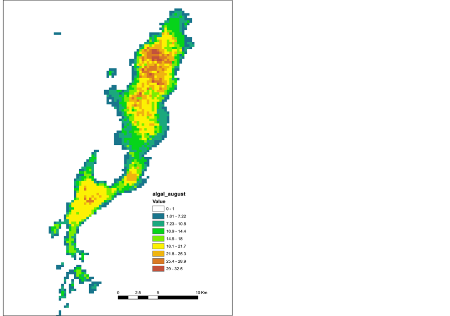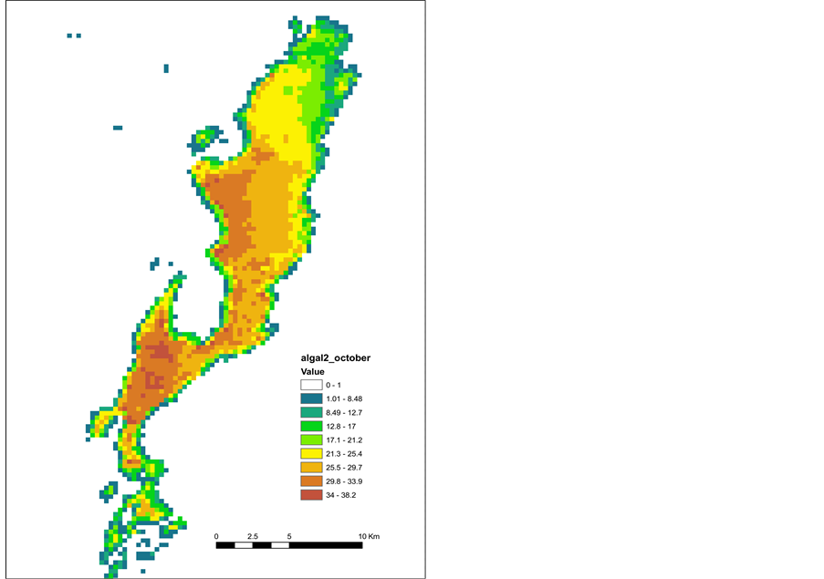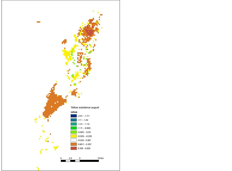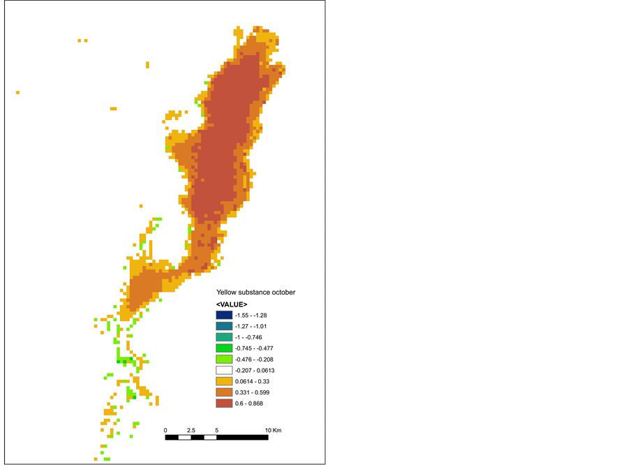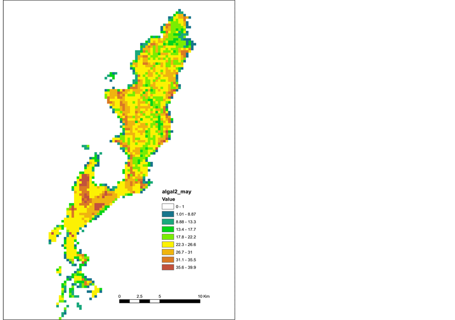 Long-range forecasting: Long-term mean-concentration values that would provide indications on the lake dynamics over time are presented in Figure 9. They range from 2.22 to 23.7 mg・L−1 for SPM, 0.134 to 29.3 μg・L−1 for CHLa and 0.081 to 0.447 m−1 for CDOM. These values are within the range of those sampled from the MERIS 1b-product level. Based on the differences in pixel color, it is possible to suggest that SPM concentrations are highest where fairly high energy conditions prevail (Figure 9(a)), viz., in the feed-water entrance of the northern zone, along the eastern near shoreline bank, and the central off-shore zone. These are places where turbidity currents and bottom currents dominate the lake hydrodynamics. In contrast, the lower SPM estimates obtained downstream, in the barrier islands protected southern inshore zone and along the western margins, are attributed to the possible influence of the vegetation. Indeed, the aquatic plants invading these shallow water environments decrease the hydrodynamic conditions, thus allowing suspended sediment to settle. These low energy environments where algal growth might be favoured, are seen (Figure 9(b) and Figure 9(c)) to exhibit the highest CHLa and CDOM values, yielding maximum pluriannual means in the ranges 23 - 29 μg・L−1 for CHLa and 0.294 - 0.447 m−1 for CDOM. The correlation between these two parameters is reflected in the similarity of their geographical distribution pattern as shown in Figure 9(b) and Figure 9(c).