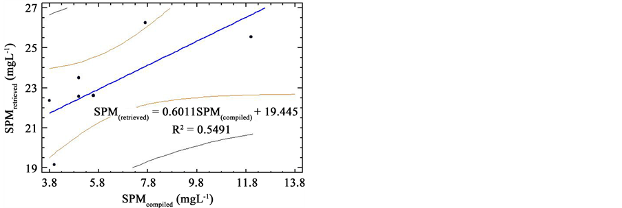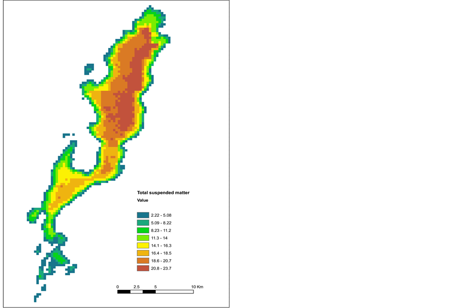 SPM values: The frequency curve for SPM (Figure 4(b)) exhibits two dominant peaks, the first at about 25 mg∙L−1, and the second at about 29 mg∙L−1. This also suggests a mixed feature and variability in the turbidity level of the lake water. However, the distribution pattern reveals that SPM values have roughly three population groupings. The fitted normal distribution curve is skewed to the left indicating that most SPM values are “larger” than the mean value of 22.03 mg∙L−1. This means highly turbid conditions throughout most parts of the lake, a finding that is consistent with similar results previously obtained by other investigators (e.g., [25] ). It could be