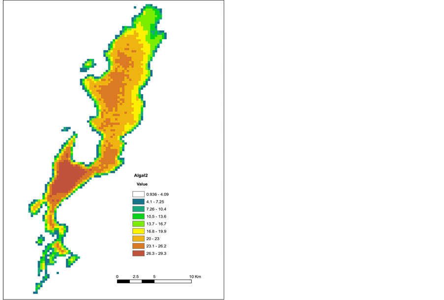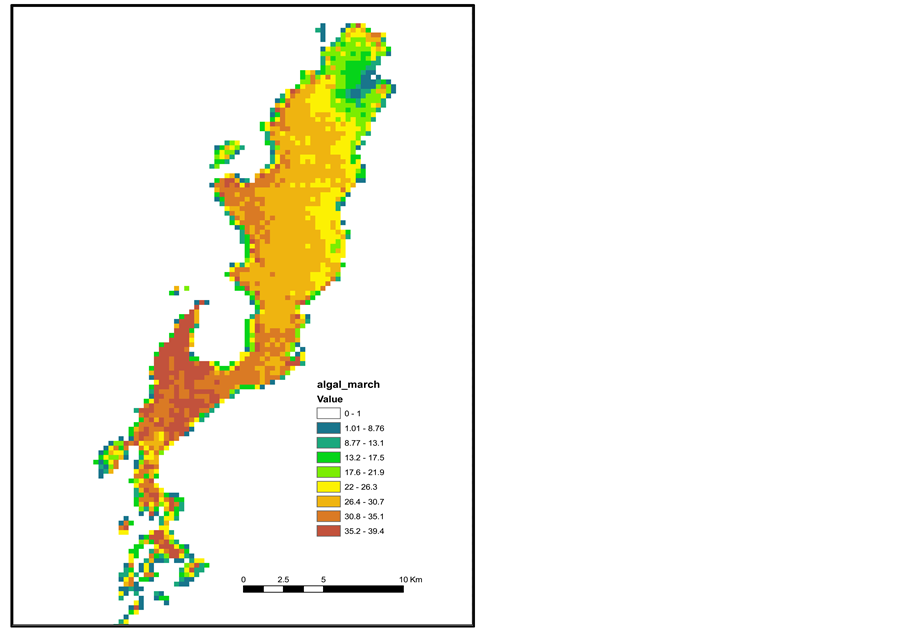 CHLa values: At least two major peaks (one at around 62 μg CHLa L−1 and another at about 72 μg CHLa L−1) can be noticed in the frequency distribution (FD) of CHLa (Figure 4(a)), which indicates mixed feature or spatial variability of the CHLa concentrations. CHLa values inferred for pixels located along the bank margins are fairly high (>80 μg CHLa L−1), resulting in the chlorophyll pigment production from the macrophytes vegetation populating the near-shore zones of the lake. Moreover, the 95% confidence interval, involving the mean for CHLa, from 61.32 to 62.94 μg CHLa L−1, is within narrow limits. This means that if the retrieved CHLa values are averaged to symbolize the standard trophic state of the lake at the time of satellite overpass, then the lake status can be deemed “eutrophic” with a 95% probability at that moment. This is consistent with field observations from early studies ([19] [24] [25] ).