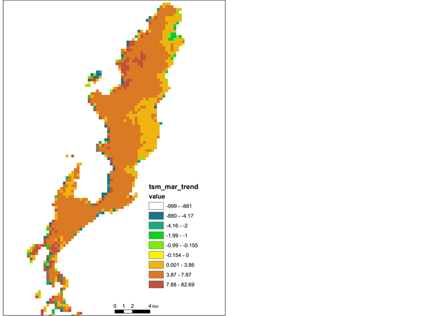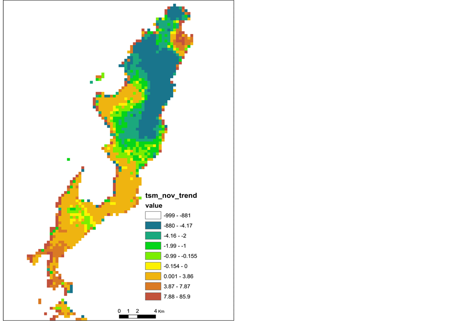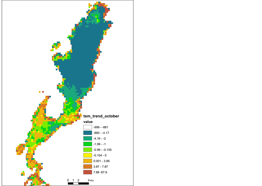 Seasonal forecasting: Assuming that changes in the WQPs concentrations come from temporal changes in the driving environmental factors, a change-detection was assessed for the period 2003 to 2010 by comparing monthly trends. In this respect, Figures 10-12 show co-extend WQP concentration maps of the monthly mean estimates averaged on the monthly scale for six selected months, starting on January each year, with an intervening interval of one month. The comparison demonstrates the general characteristics of the seasonal variability for each WQP. It can be seen that SPM contents are highest around the month of March (Figure 10) when dust storms from the Sahara Desert are active, and during the rainy period (i.e. August) as turbid runoff river water, that carries a large amount of bed- and suspended-load, flows into the lake.