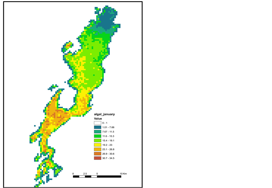 Understanding the lake’s dynamics is an important issue for the lake waters management. However, it was not possible to critically examine this issue in this study due to lack of background information. In fact, the methodology requires the need to address the driving forces that affect phytoplankton growth rate that might have an impact on CHLa concentrations. The approach should also take account of the different causes of lake water turbidity, as well as the sources and mechanism of particles input. Many eutrophication models ([32] and [33] ) have demonstrated the role of water temperature, intensity of sunlight and nutrients dynamics for phytoplankton growth. However, a high growth level also requires reduced water movement (i.e. quiet flow conditions). This is because under high flow, a turbulent hydrologic regime may develop, resulting in turbid waters and strong bottom-water currents that fall into intolerable limits for algal biomass development. Turbidity mainly comes from feeding runoff river water streams that carry large amounts of bed- and suspended-load solids into the lake. This may also possibly originate from sand particles introduced to the lake by Saharan sand storms and particles resuspension due to bottom currents. As part of Objective 2 the following tentative interpretation was made from a chronological series of MERIS 2b-image products, based on these sources.