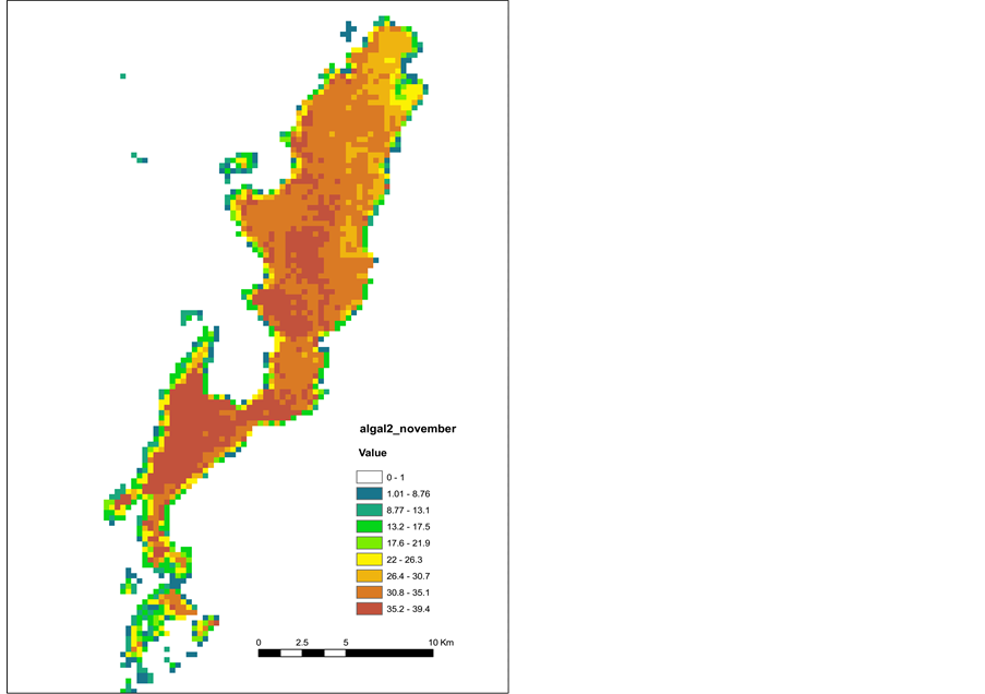 Figure 11. Mean monthly spatial distribution of CHLa (Period 2003-2010). Note: the comparison shows the November month with the highest abundance estimates of phytoplanktonic organisms.