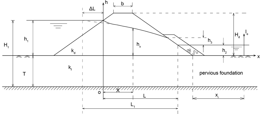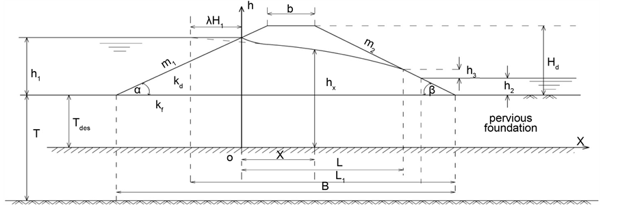 where h1 is the headwater depth, h2 is the tail water depth, h3 is the vertical height of seepage surface, kd is the coefficient of permeability of the dam material, Tdes is the design depth of the pervious layer (Tdes equals the lowest value of T or Ta, where T is the actual depth of the pervious layer, and Ta is the depth of the active zone of seepage,