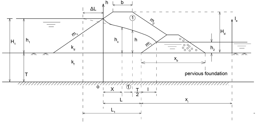 A purely homogeneous dam, which is composed of one kind of material only, is considered in the analyses. An analytical solution that solves the problem of the seepage through an earth dam based on pervious base, as shown in Figure 1, was presented by Grishin [2] . Results of this case were considered as a reference data to be used for comparison between the different toe drainage systems. The embankment slopes must be relatively flat to avoid sloughing of the upstream face due to rapid drawdown of water surface in the dam reservoir. On the other hand, the downstream face must be safeguard against sliding wherever the probable slip circle is existed.