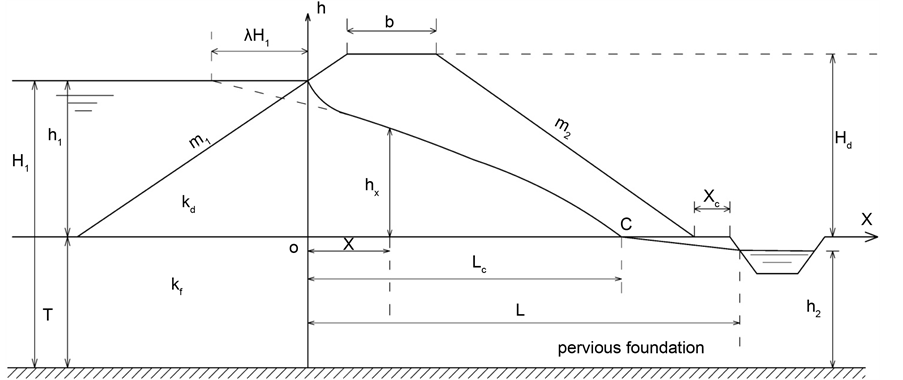 In the calculation procedure, both the coefficient of permeability for the dam embankment (kd) and the foundation (kf) are considered the same, i.e. (kd = kf). In addition, the case of dry downstream condition was accounted for (h2 = 0.0) to give the maximum effective head (H).