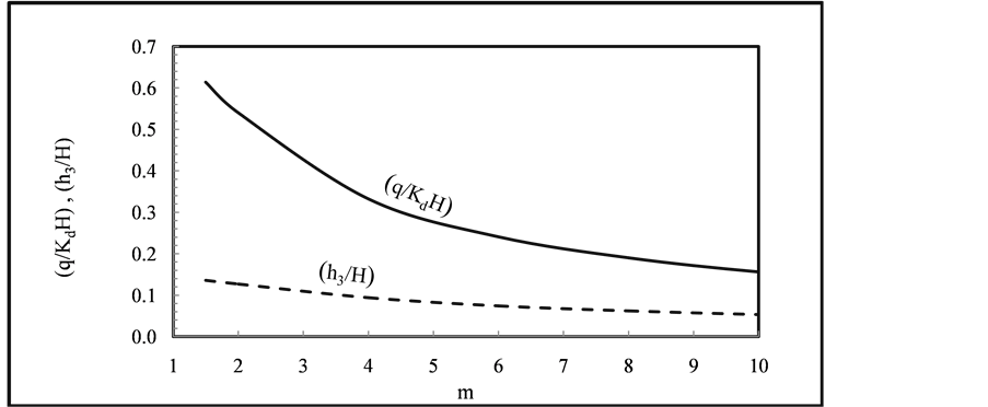 Figure 6. Variation of seepage parameters ((q/KdH), (h3/H)) with the slope factor (m) for homogeneous earth dam for (T/B) = 0.5, and (H/B) = 0.25.