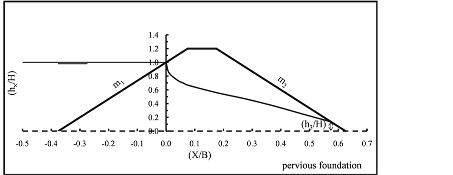 Figure 7. Free surface through homogeneous earth dam based on pervious foundation for m1 = m2 = 1.5, (T/B) = 0.5, and (H/B) = 0.25.