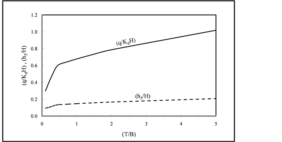 The effect of the pervious layer depth (T), on the seepage parameters ((q/KdH), (h3/H)), was analyzed using different relative values of (T/B), as presented in Figure 8. It is clear that, increasing the relative depth of the pervious foundation (T/B) from 0.10 to 0.50, results in a rapid increase in values of (q/KdH) beyond which, these values gradually increase. The percentage of increase in (q/KdH) due to increasing value of (T/B) from