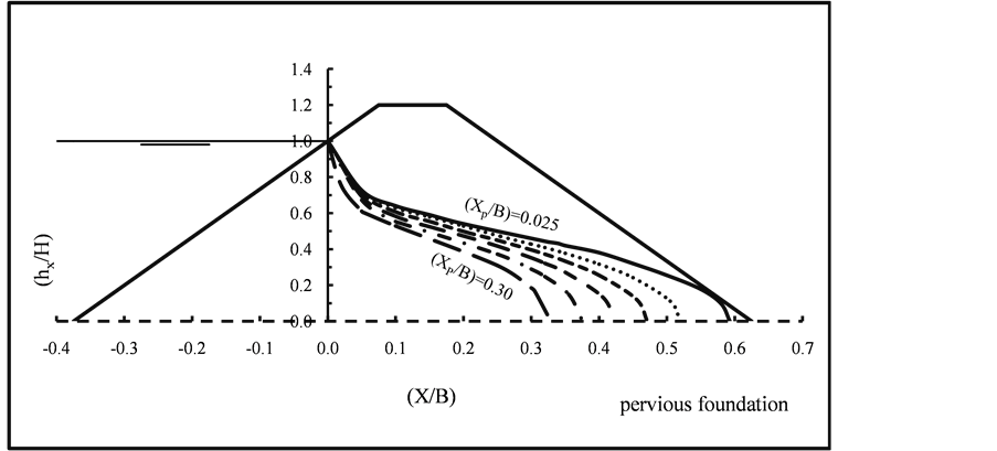 Figure 9. Free surface through modified earth dam with pipe drainage for different values of the relative location (Xp/B) for m1 = m2 = 1.5, (T/B) = 0.5, and (H/B) = 0.25.