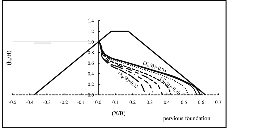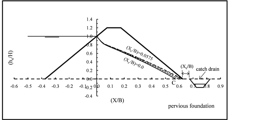 Figure 14. Free surface through modified earth dam with catch drain in tail water for different values of the relative location (Xc/B) for m1 = m2 = 1.5, (T/B) = 0.5, and (H/B) = 0.25.