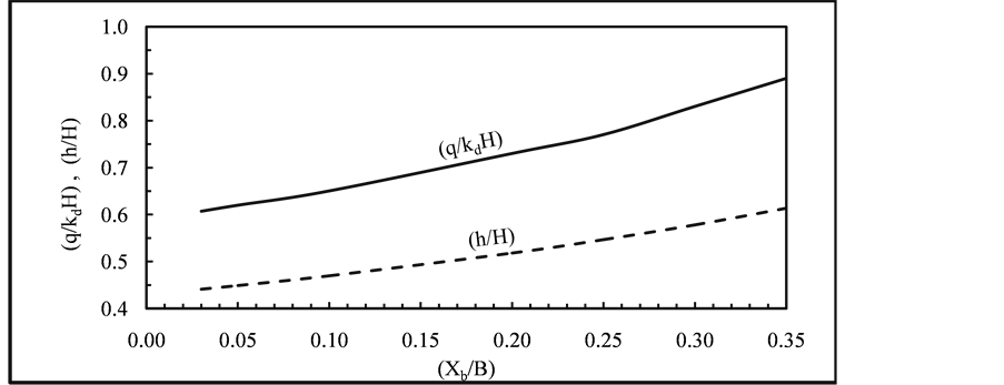 Figure 12. Variation of (q/KdH), and (h/H) with the relative banquette length (Xb/B) for m1 = m2 = 1.5, (T/B) = 0.5, and (H/B) = 0.25.