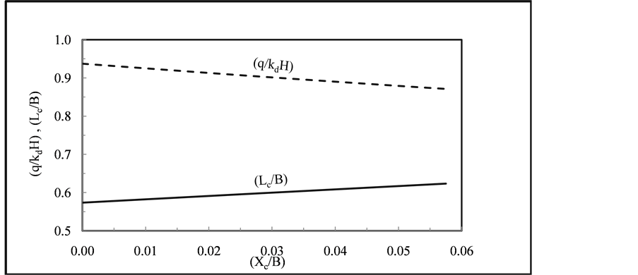 Figure 13. Variation of (q/KdH) and (Lc/B) with relative location of the catch drain (Xc/B) for m1 = m2 = 1.5, (T/B) = 0.5, and (H/B) = 0.25.