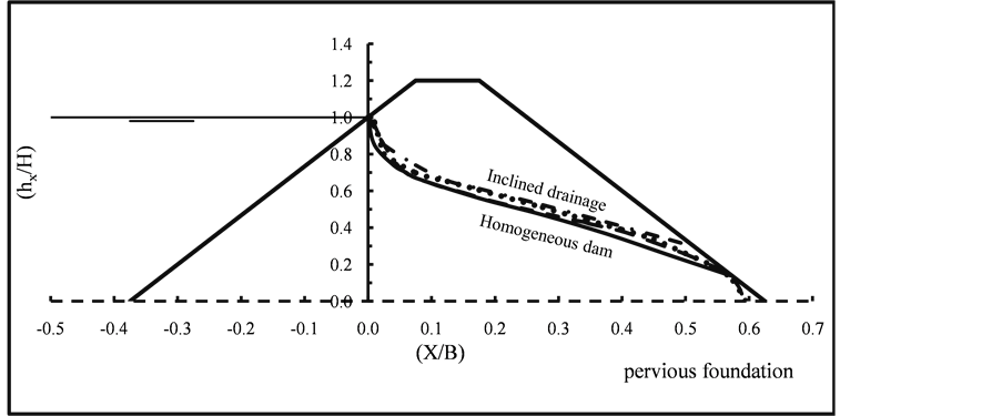 The free surfaces through homogeneous and modified earth dams are shown in Figure 15 for m1 = m2 = 1.5, (T/B) = 0.5, and (H/B) = 0.25. It is seen that, the free surfaces for the toe drainage systems are nearly close to each other and slightly lie above the free surface for the homogeneous dam.