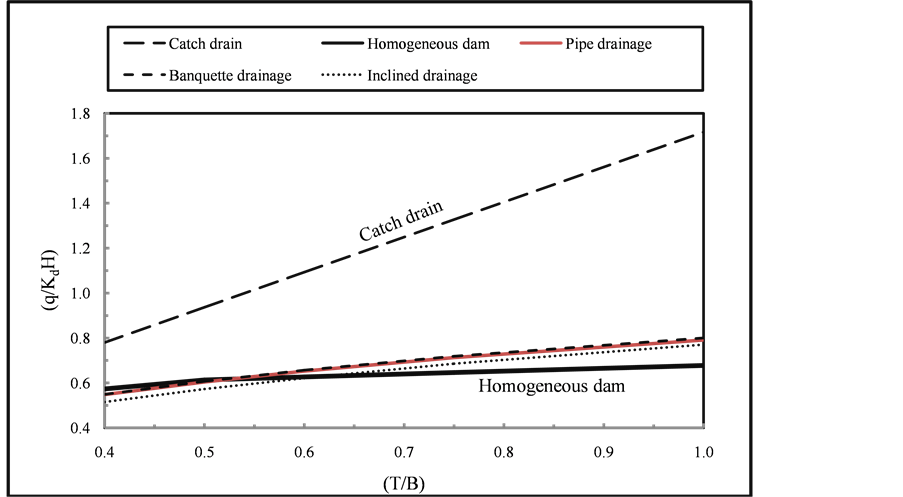 Table 1. Values of (q/KdH) corresponding to relative depth of the pervious foundation (T/B) for homogeneous and modified earth dams for m1 = m2 = 1.5, and (H/B) = 0.25.