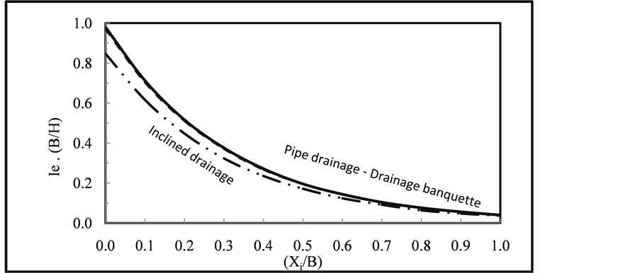 Figure 17. Variation of relative exit gradient (Ie∙(B/H)) with relative distance (Xi/B) for modified earth dam with pipe drainage ((Xp/B) = 0.025), drainage banquette ((Xb/B) = 0.03), and inclined drainage for m1 = m2 = 1.5, (T/B) = 0.5, and (H/B) = 0.25.