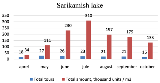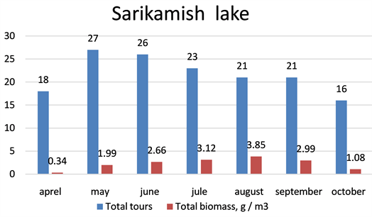 As a whole, the lake is the serum of the zooplankton, and in its summer season its quantitative indicator is 230 - 311 thousand per/m3, and biomass―up to 3.12 - 3.85 g/m3. The maximum development of Zooplankton corresponds to the summer months (Figure 2).