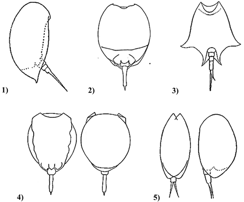 Colurellaadriatica (Ehrenberg, 1831) (Figure 3(1)): L = 90 - 100 mkm, length―40 - 50 mkm. The pantsir sank into the lateral force (flattened). She has a hole. The next edge of the pantsir is extended to two sharp thorns. The elbow is in the form of a large triangle on the last edge. Leg cuffs are compacted with one another, their length is 35 - 40 mc. It was found in the border zone of Sarikamish Lake.