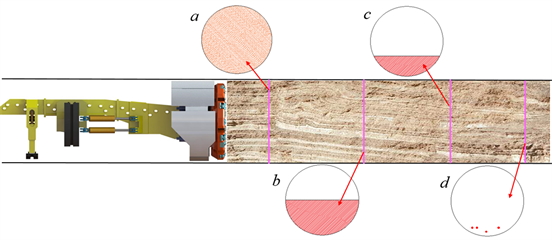 According to the statistics of engineering geology, the location of TBM contains many strata in the process of tunneling, and the distribution characteristics of strata are uncertain. According to the research of relevant scholars, the changing trend of strata on the cutterhead tunneling interface and the distribution and combination of different geology have great influence on the fluctuation and magnitude of cutter head load. Therefore, it is necessary to deal with the stratigraphic distribution. This article uses classical working conditions to equate possible geological forms. The working conditions that may occur during the tunneling process are attributed to the maximum thrust condition, the maximum overturning condition, the turning and correcting condition and out of difficult condition. The typical working conditions are shown in Figure 1. The maximum thrust condition refers to the equivalent condition of TBM driving along a straight line under uniform geology. At this time, all the cutters are subjected to rock breaking load, and the cutterhead system bears the maximum load, and its force section is shown in Figure 1(a); Maximum overturning condition refers to the equivalent condition of TBM driving in composite strata. At this time, half of the cutter of the cutterhead contacts the rock, and the cutterhead system bears large loads and bending moments, and its force section is shown in Figure 1(b); The turning and correcting condition means that there is a certain angle between the cutterhead surface and the tunneling surface, only part of the cutter is subjected to force, and its force section is shown in Figure 1(c). When TBM is driving, it may encounter problems such as the lone stone or the edge cutter being stuck. At this time, the cutterhead torque must be increased. The cutter head is subjected to the maximum torque under this condition, and its force section is shown in Figure 1(d).