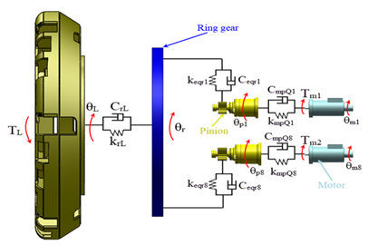 The TBM cutterhead system includes cutterhead, ring gear, pinion, shield, reducer and motor. The typical cutterhead forms are integrated cutterhead (IC), two-part cutterhead (TPC), and five-part cutterhead (FPC). The cutterhead, ring gear, pinion, shield and motor are equivalent to mass points, and the pinion and red tarder are equivalent to a mass point. The equivalent mechanical model of cutterhead is established, as shown in Figure 2.