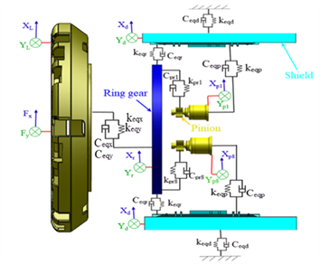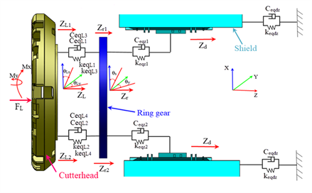 mδ(δ = L, r, d, pj) represents the equivalent mass of cutterhead, ring gear, shield and pinion, respectively. keqδ(δ = x, y, L, r, z, d, dz, p) represents horizontal equivalent support stiffness of cutterhead, longitudinal equivalent support stiffness of cutterhead, radial equivalent support stiffness of ring gear, axial equivalent support stiffness of ring gear, horizontal equivalent support stiffness longitudinal equivalent support stiffness and axial equivalent support stiffness of shield, and the equivalent support stiffness of the pinion respectively. Ceqδ(δ = x, y, L, r, z, d, dz, p) represents horizontal damping coefficient of cutterhead, longitudinal damping coefficient of cutterhead, radial damping coefficient of ring gear, axial damping coefficient of ring gear, horizontal damping coefficient, longitudinal damping coefficient and axial damping coefficient of shield, and the damping coefficient of the pinion respectively. TL, Tmj, FXi, FY, MX, MY, FL represents cutterhead torque, motor torque, cutterhead horizontal load, cutterhead longitudinal load, cutterhead overturning moment, cutterhead axial load.
