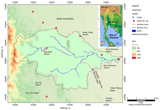The study area, Huai Khun Kaew watershed, with a drainage area of 1066 km2 locates in the Upper Tha Chin River Basin in Uthai Thani and Chai Nat Provinces, Thailand. The Huai Khun Kaew is a major stream and contains with the largest tributary: Huai Khot with the flow direction from east to west. The hydrological observation station, C.51, has been installed at the outlet by the Royal Irrigation Department (RID). The Huai Khot-Wang Man diversion canal was built to convey some part of a flood from existing watershed to the Nong Mamong District in Chai Nat Province.