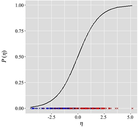 Figure 4. Probability distribution of switching from the prior choice. It shows the linear predictor of switching, , to participants who switched from Laptop A to Laptop B (in red) and to those who did not (in blue). The larger , the bigger , and vice versa.