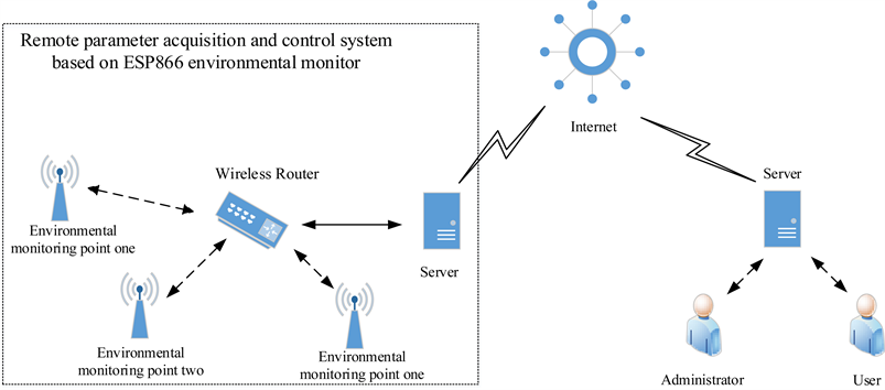 The system network data transmission diagram is shown in Figure 1. The environmental detector monitors the atmosphere, water and soil in the environment, and the environmental monitoring point reads the pollution parameters collected by the front-end environmental monitor, and builds corresponding points at each monitoring point. The server collects the environmental information collected by the monitoring environment monitor through the wireless router, including air quality, pollution degree and related meteorological parameters, and then transmits the corresponding data to the network for storage and subsequent analysis and processing through the server. Administrators and users can remotely manage and browse based on the privilege level.