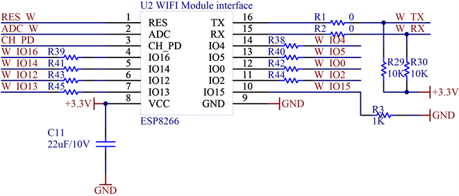 The wireless communication adopts the ESP8266 module, which has built-in TCP/IP protocol stack [7] and has two transmission modes of UDP/TCP. The circuit diagram is shown in Figure 3.