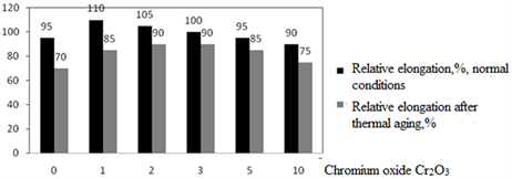 Some decrease in conditional strength and relative elongation when the content of chromium oxide is more than 5 mas.% at 100 mas.% rubber is probably due to precipitation of the filler.