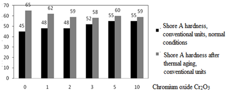 Analysis of the diagrams shows that, after thermal aging, the modified specimen’s exhibit conditional strength and elongation at break, and their hardness is lower than that of the control sample, which does not contain chromium oxide. At the same time, under normal conditions, these indicators depend slightly on the content of chromium oxide.