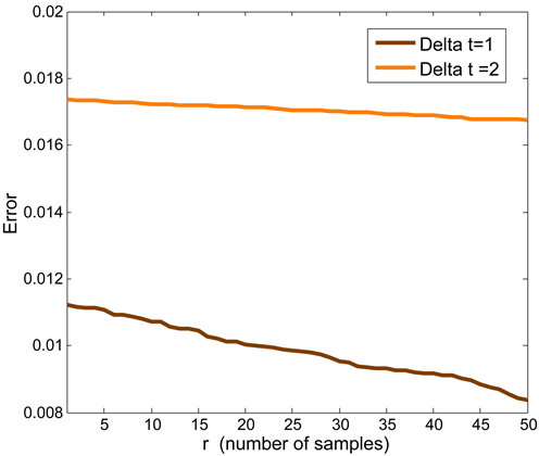 We therefore used the above simplified formulas (35) and (36) to model Equation (37) in Matlab, in our program we used the , and let be the first open price. The rate of interest we used was , we choose and through our calculation we obtained the value of an option using the Donsker Delta Function approach as