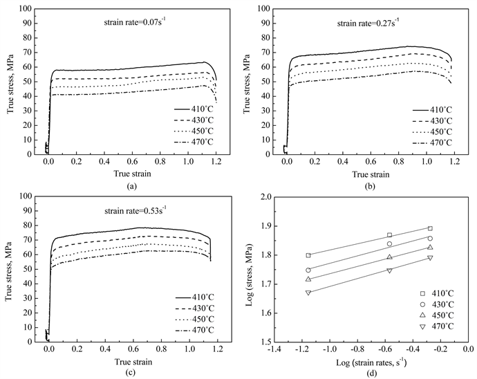 Figure 1. True stress-strain curves ((a)-(c)) and the relationship between flow stress and strain rate (d).