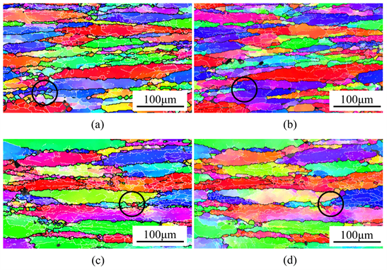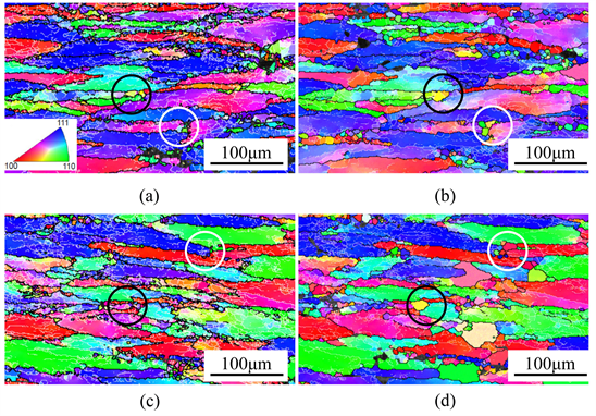 Quasi in-situ observation is carried out for the deformed specimens after solution treatment at 502˚C for 3 hours (Figure 2(b) and Figure 2(d)). The microstructures keep a similar overall morphology to the deformed microstructures, except three noticeable characteristics. Firstly, the small sized DRX grains grow to a certain extent, even crystal merging for different orientations, indicated by black circle in Figure 2(b) and Figure 2(d). Secondly, new DRX grains develop at tirple junctions with high storage energy, noted by the white circle. In addition, the lattice distortion indicated by color gradient has faded and evolved into regular sub-grain boundaries. These three characteristics, including the grain