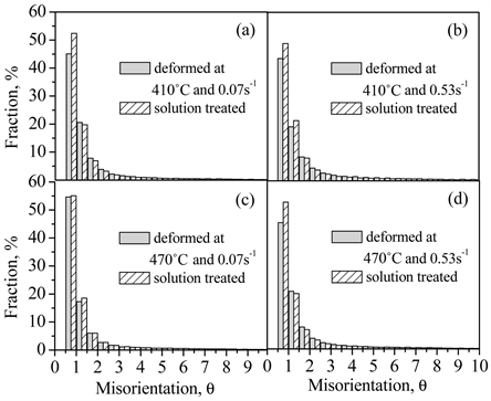 Figure 4. Misorientation distributions of 2014 alloy deformed at different conditions (gray bars) and then solution treated (shadow bars).